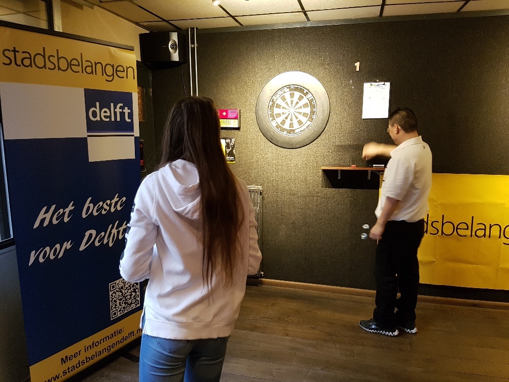 Afgelopen zaterdag was de Stadsbelangen Delft dartwedstrijd in Café Friends onder aanvoering van onze nummer 6 Martien de Koning. De darters moesten punten gooien op verschillende thema’s zoals lagere woonlasten, 55+ centrum in de wijk, groene leefomgeving, goed onderwijs, veiligheid en rode loper.